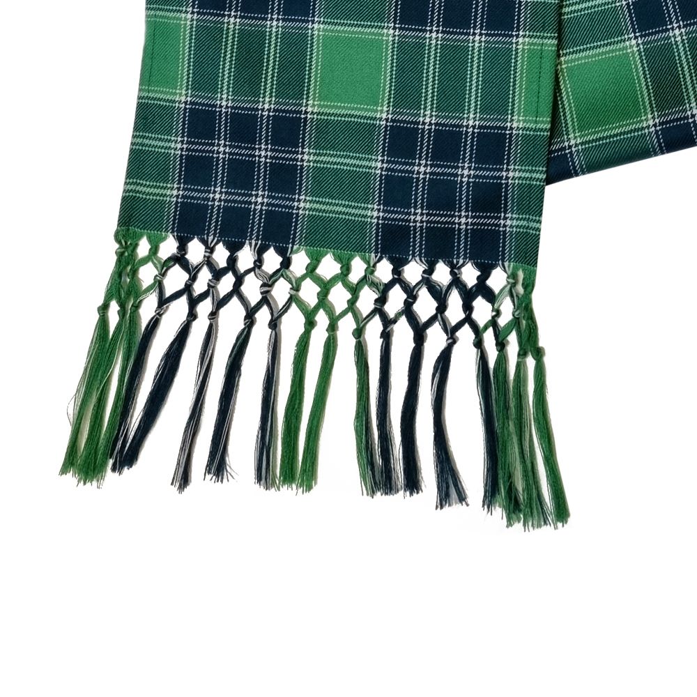 The Kinloch Anderson Evening Sash is truly exceptional. It is a beautifully woven lightweight 100% Pure Wool fabric with a delicate knotted fringe finish.