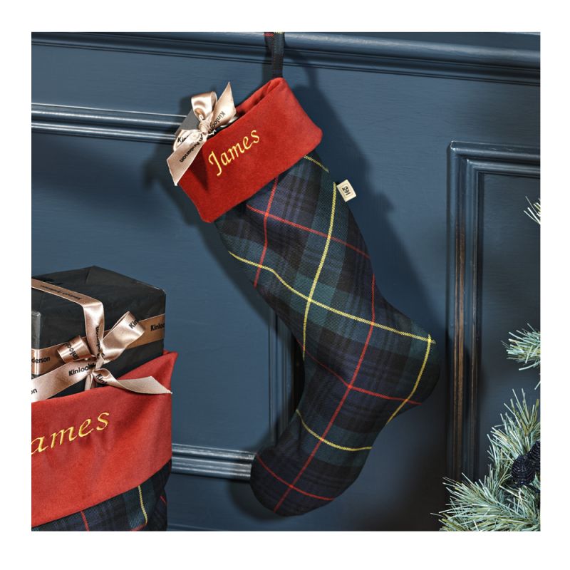 Beautifully created Christmas stocking which will enhance any mantelpiece this Festive Season. Made in Stewart Hunting Tartan. Each one is made from 100% wool tartan cut on the bias to give a stylish and modern effect with a luxurious velvet cuff. The stocking is fully lined and has a tartan hanging loop to complete it.