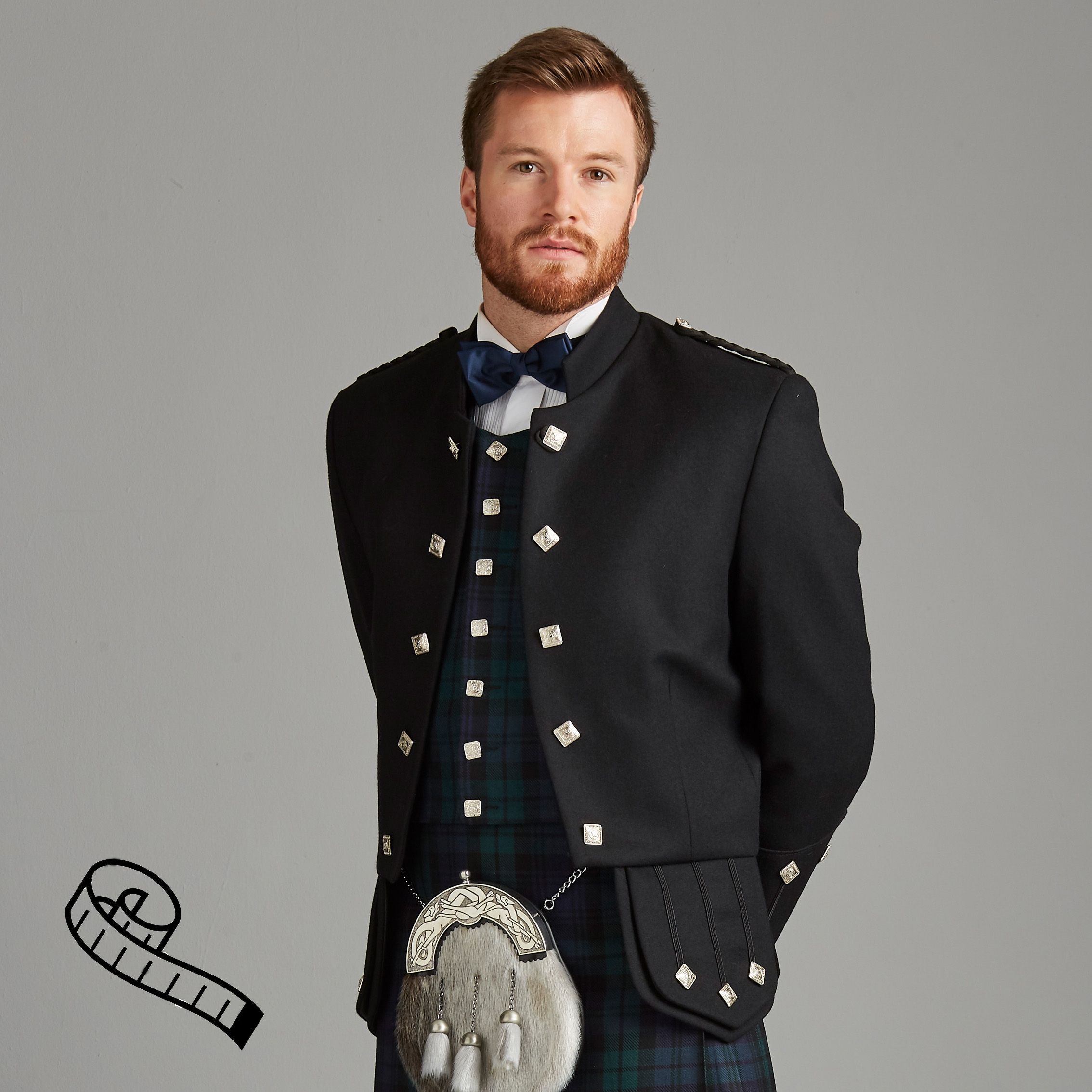 The Kinloch Anderson Sheriffmuir Doublet is a tailored formal evening jacket. It is made using premium qualitty Black Barathea and has a high collar, is fastened at the top button and has a curved cut-away front featuring 5 Celtic buttons on either side. There are three Celtic buttons on each cuff with epaulettes with Celtic button on each shoulder. The flaps at the front and back also have three ...Read More > Celtic buttons.