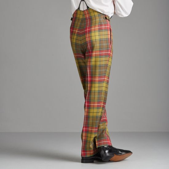 Kinloch Anderson offer two styles of tartan trousers: either with straight waistband positioned as for regular suit trousers or with a high waisted fishtail back (which also makes them suitable to wear with a Coatee & Vest). Kinloch Anderson tartan trews are normally made to order in the customer’s preferred tartan.