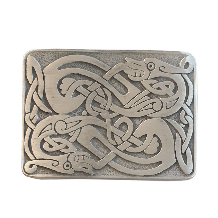 This classic design Belt Buckle is made from pewter with matt finish. It features an intricate Zoomorphic design intertwining with detail. It is worn with a belt for a day or evening event.